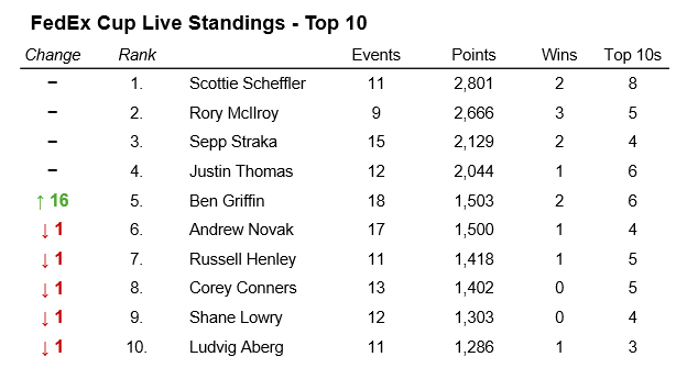 Top 10 Movements: Ben Griffin propels 16 spots on the FedEx Cup points list following his win at the Charles Schwab, knocking Harris English out of the Top 10