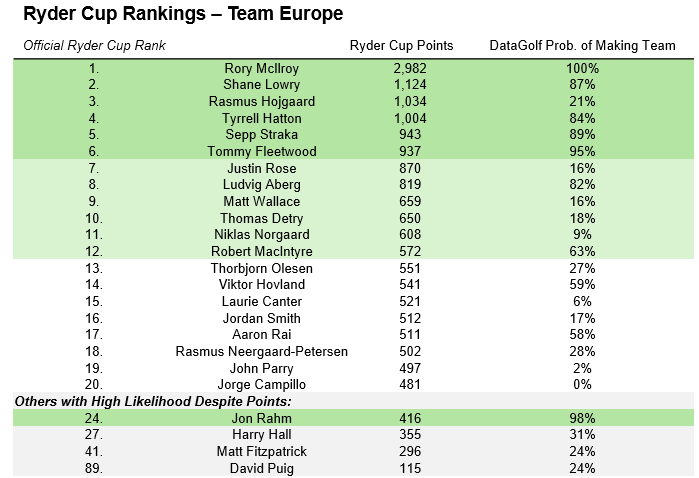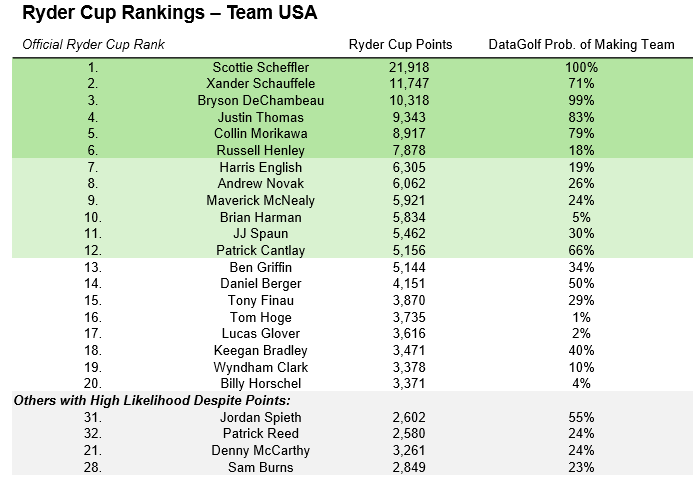 Additionally, we have included Datagolf’s model probability of making the team for each player for a second data point here.