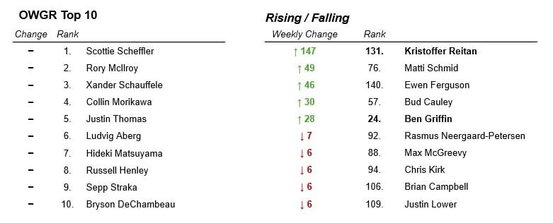 Big Movers Up: Breakthrough solo win for Ben Griffin at the Charles Schwab vaults him up 28 spots into the Top 25; Kristoffer Reitan has his first DP World Tour win at the Soudal Open