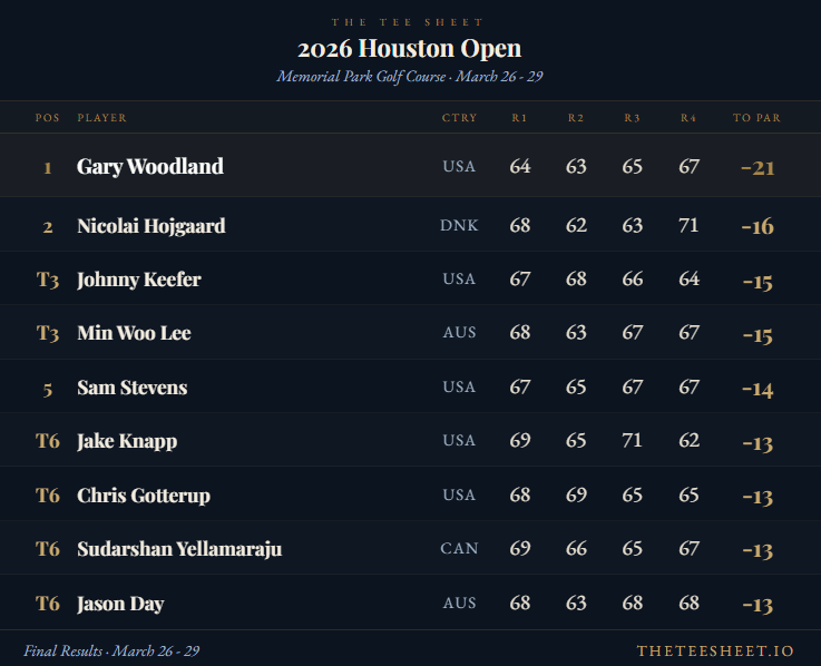 It wasn't, really. Højgaard bogeyed the first hole Sunday, then made double on the par-3 seventh, and it never got very close from that point on. Woodland, meanwhile, was flawless on the front — a bogey-free 31 — stretching his lead to six shots before the turn. He played the back nine conservatively at one over and it didn't matter. Woodland closed with a 67 to finish at 21-under 259, a tournament record at Memorial Park, winning by five over Højgaard.