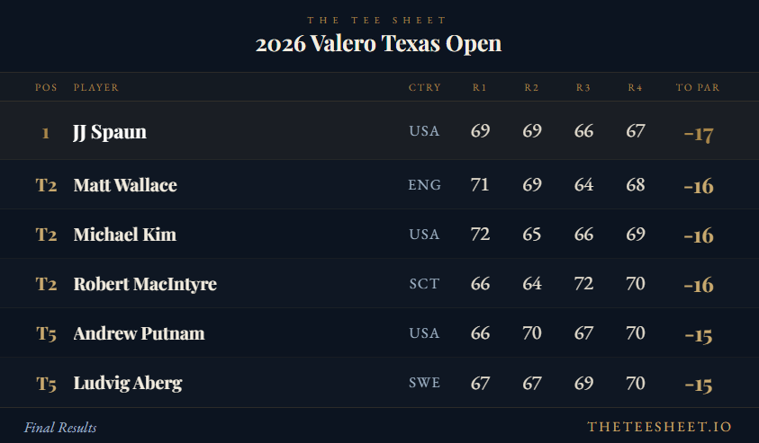 JJ Spaun finished off the pre-Masters Florida-Texas swing with a victory at the Valero Texas Open on Sunday — his second win at TPC San Antonio and his first since winning the US Open last summer. He closed with -5 on Sunday in difficult conditions to set the clubhouse target at -17. Robert MacIntyre — who had led the tournament entering Sunday — needed birdie on 18 to force a playoff and couldn’t find it.